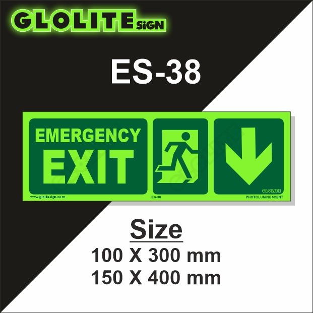 The Emergency Exit ES-38 is a high-visibility photoluminescent safety signage specifically engineered to provide clear direction during critical situations like fire emergencies, power failures, and natural disasters. With its glowing “EMERGENCY EXIT” text, this sign is easy to identify in low-light or no-light conditions, ensuring that building occupants can locate safe egress routes without confusion or delay. Whether it's installed in a commercial complex, healthcare facility, or industrial unit, the ES-38 plays a vital role in helping people exit safely and efficiently when time matters most.