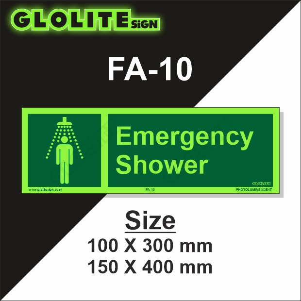 The FA-10 sign is crafted from high-grade photoluminescent material that charges under natural or artificial light and glows brightly in dark or low-light conditions. It features a universal emergency shower icon along with bold text, making it easy to recognize instantly. Built from durable, weather-resistant materials, it can be used both indoors and outdoors without fading or deterioration. The sign is also maintenance-free and easy to install, fitting seamlessly onto walls, doors, or equipment surfaces near emergency shower stations.