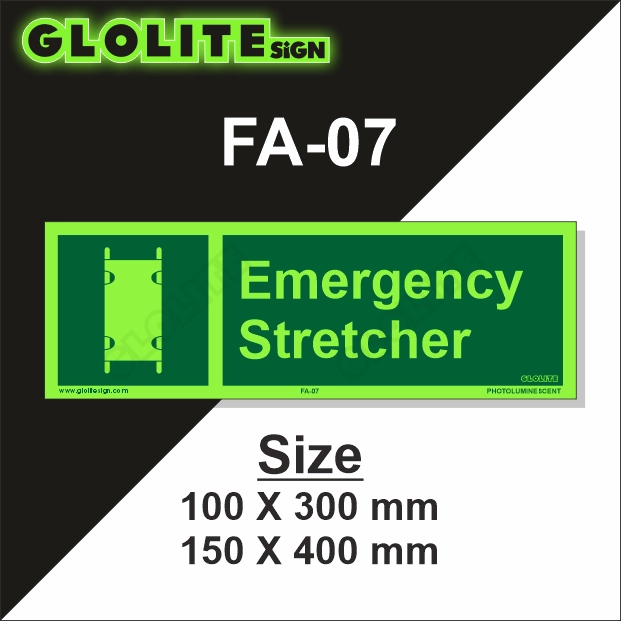 This signage is manufactured using high-performance photoluminescent materials that absorb ambient light and emit a bright, visible glow in darkness without any power source. It displays a recognizable stretcher symbol and text on a green background, adhering to standard safety color codes and symbols. The Emergency Stretcher FA-07 sign is durable, waterproof, UV-resistant, and built to withstand harsh industrial or outdoor environments. Easy to mount and maintain, it ensures long-lasting visibility and performance, contributing to overall safety and emergency preparedness protocols.