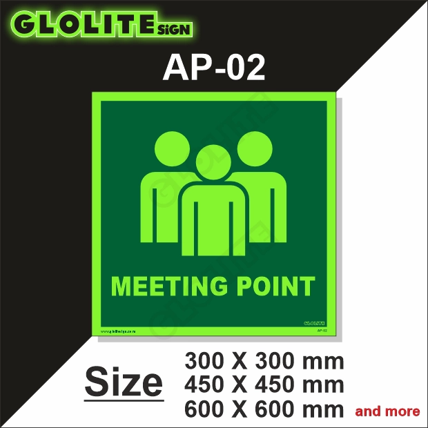 The Meeting Point AP-02 signage is designed to clearly indicate a centralized and secure location where people should gather during emergencies or evacuation drills. Its primary function is to aid in the swift and safe coordination of individuals—whether employees, visitors, or residents—ensuring everyone is accounted for in crisis situations such as fires, earthquakes, or building evacuations. This sign plays a vital role in emergency preparedness by minimizing confusion and panic, guiding people confidently to a designated meeting area. With its photoluminescent visibility, the sign remains legible even in the event of power failure or low-light conditions, offering round-the-clock reliability.