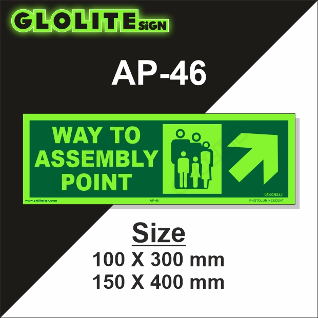 The Way to Assembly Point AP-46 signage is an essential emergency guide designed to lead building occupants to the nearest safe assembly area during critical situations such as fire, earthquake, or other evacuations. With its photoluminescent properties, this sign remains clearly visible in the dark or in low-light conditions, offering a reliable directional aid even during power outages. Its bold arrow indicator and universally recognized assembly point symbol make it instantly understandable, helping people navigate safely and efficiently during an emergency evacuation.